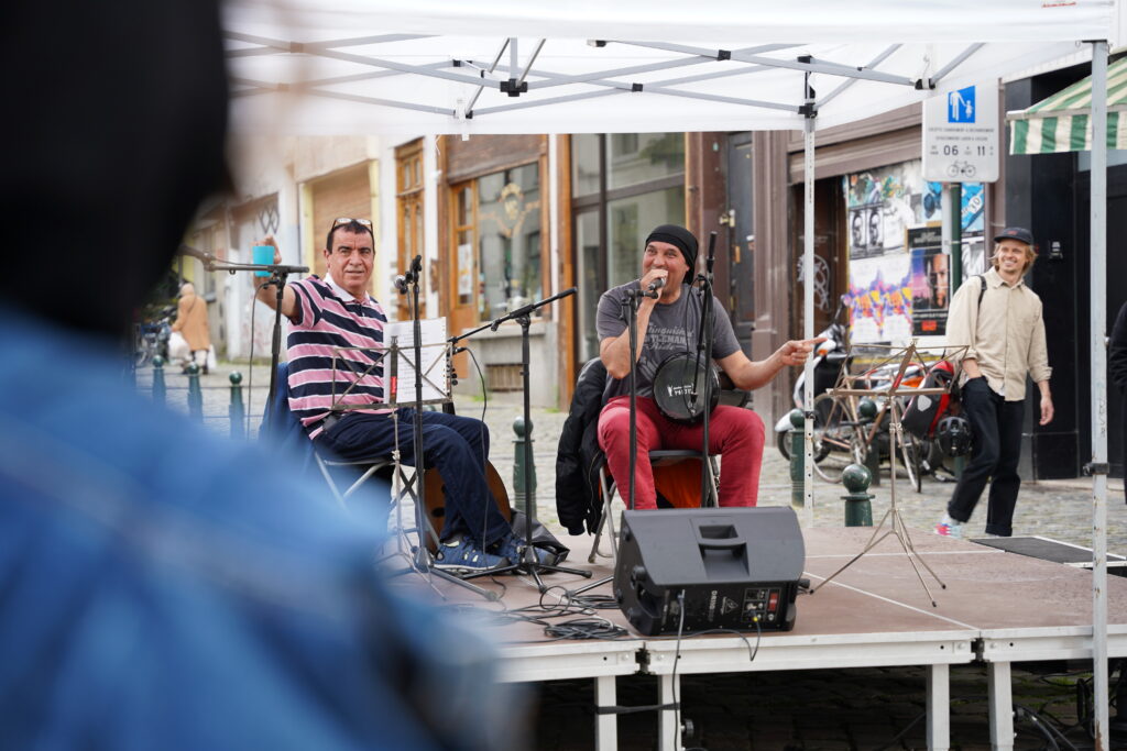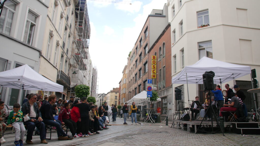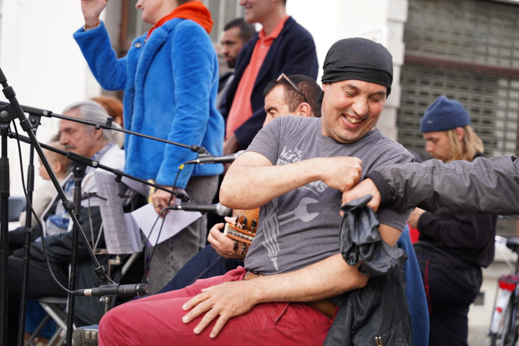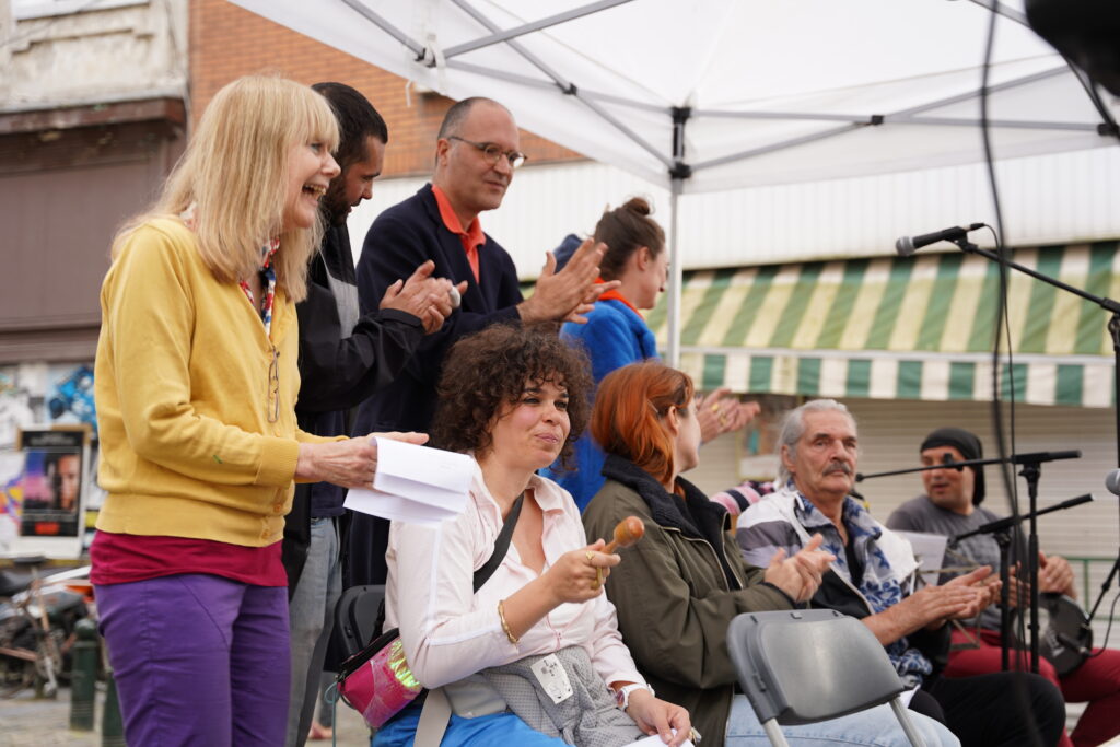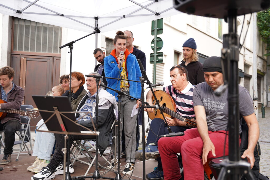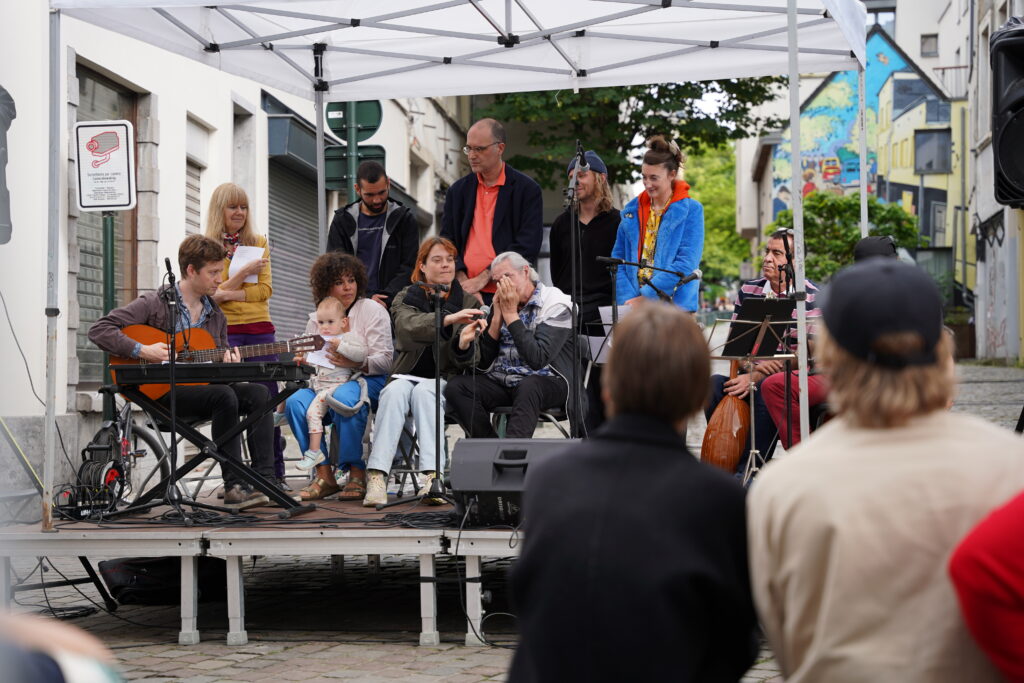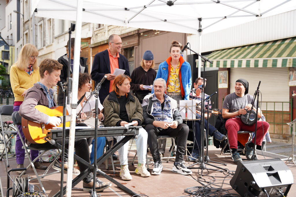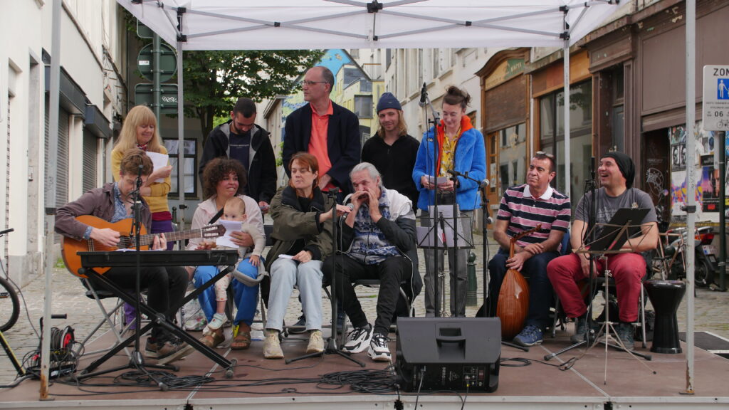 Avec les habitant.es des Marolles qui viennent le mercredi pour l’atelier de musique que l’on propose à l’Axoso, nous étions ravi.es de faire notre premier concert vendredi passé le 31 mai à l’occasion de la fête des voisin.es des Tanneurs. On s’est lancé dans la présentation de 6 titres que l’on s’est transmis et avons arrangé ou réarrangé pour l’occasion.