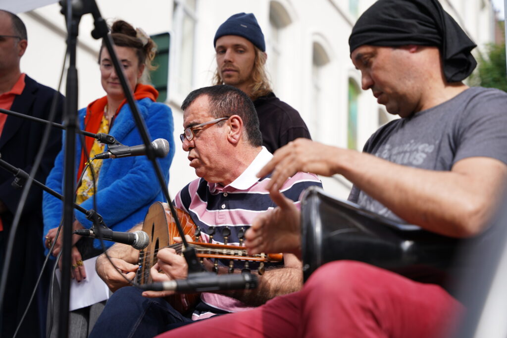 A l’atelier du mercredi, on peut venir avec son instrument de prédilection, être déjà musicien.ne ou juste aimer partager la musique qu’on aime. « Ya Bahriya » est un chant de lutte palestinien que Shafik, joueur de oud, nous a appris et que l’on chante toustes ensemble. Ici accompagné par Moustafa à la darbouka.